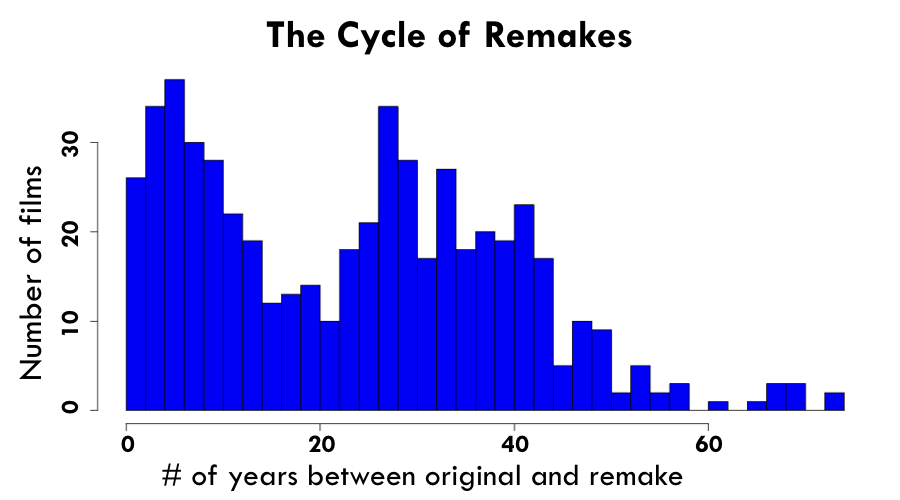 In the research done by Patrick Metzger he studied 500 film remakes and found that the 30-year cycle was backed up by his findings, showing a large amount of remade films come out around 30 years after the original.